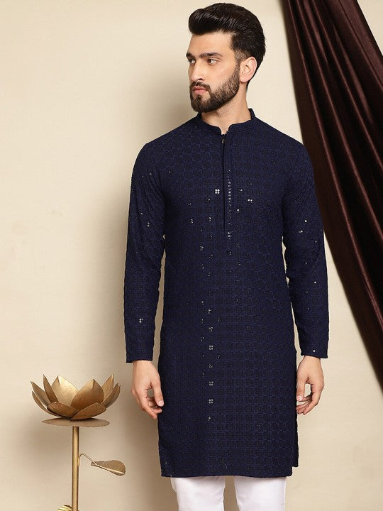 Title: Navy Blue Ethnic Motifs Embroidered Sequinned Mandarin‑Collar Pure Cotton Kurta