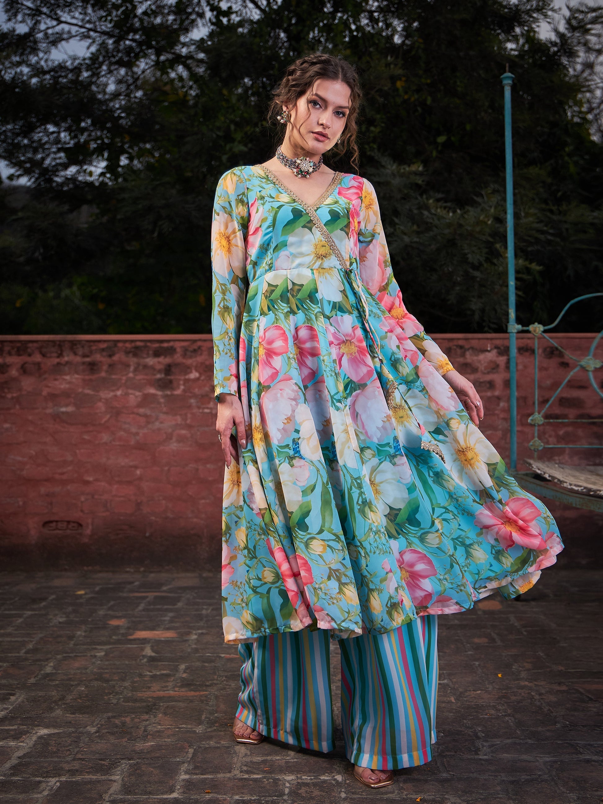 Women Aqua Blue Floral Wrap Anarkali Kurta With Stripes Palazzo