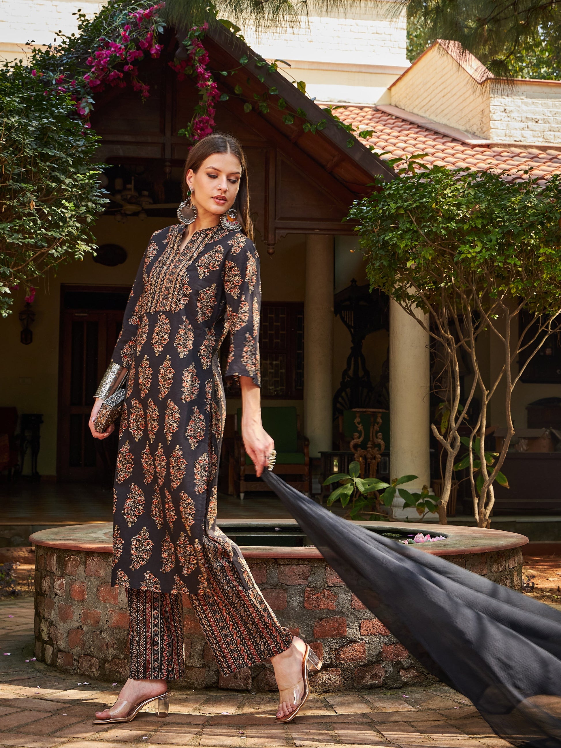 Women Black Floral Straight Kurta With Pants & Dupatta