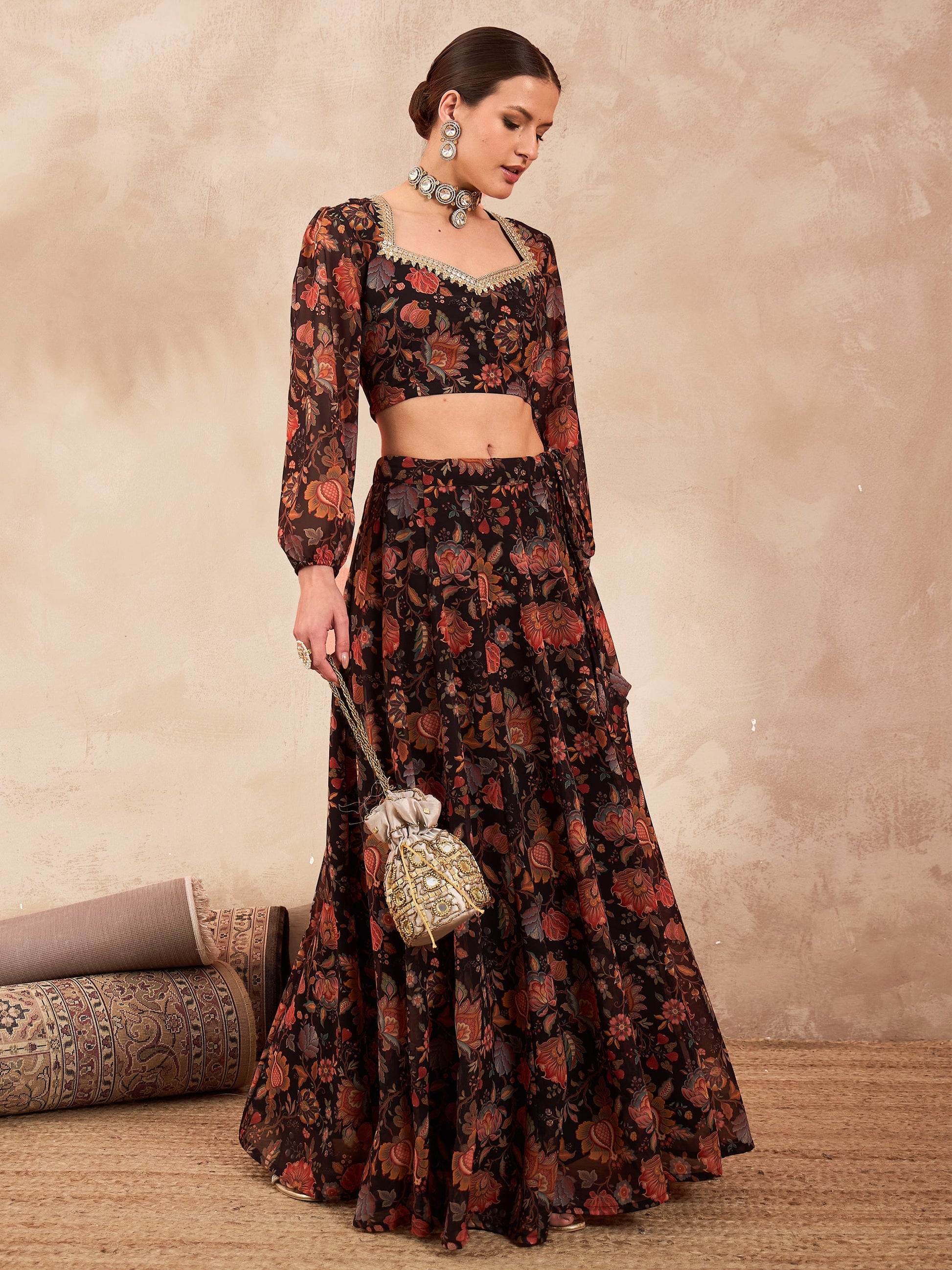 Women Black Floral Sweetheart Neck Crop Top With Anarkali Skirt