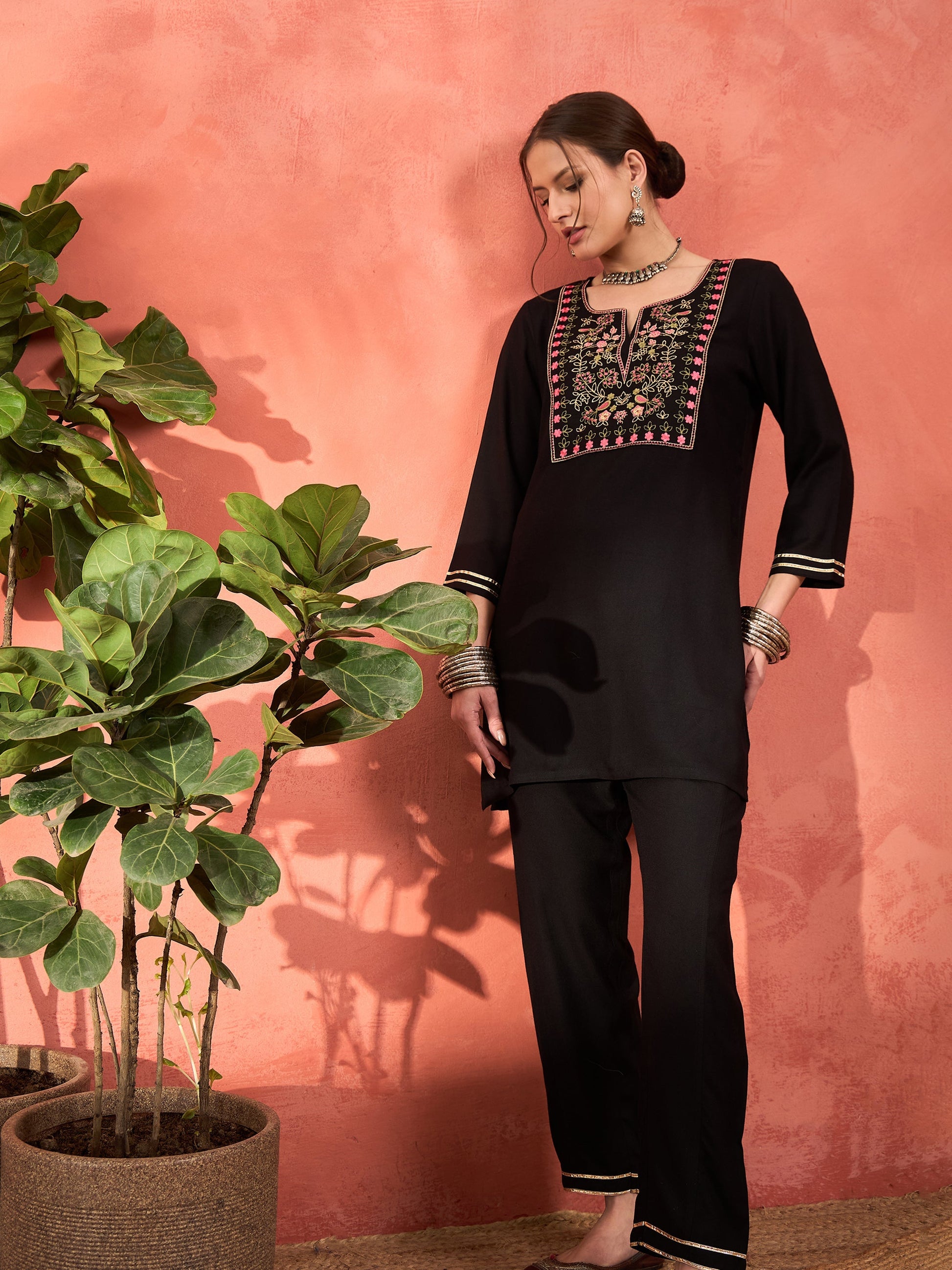 Women Black Rayon Embroidered Short Kurta With Salwar
