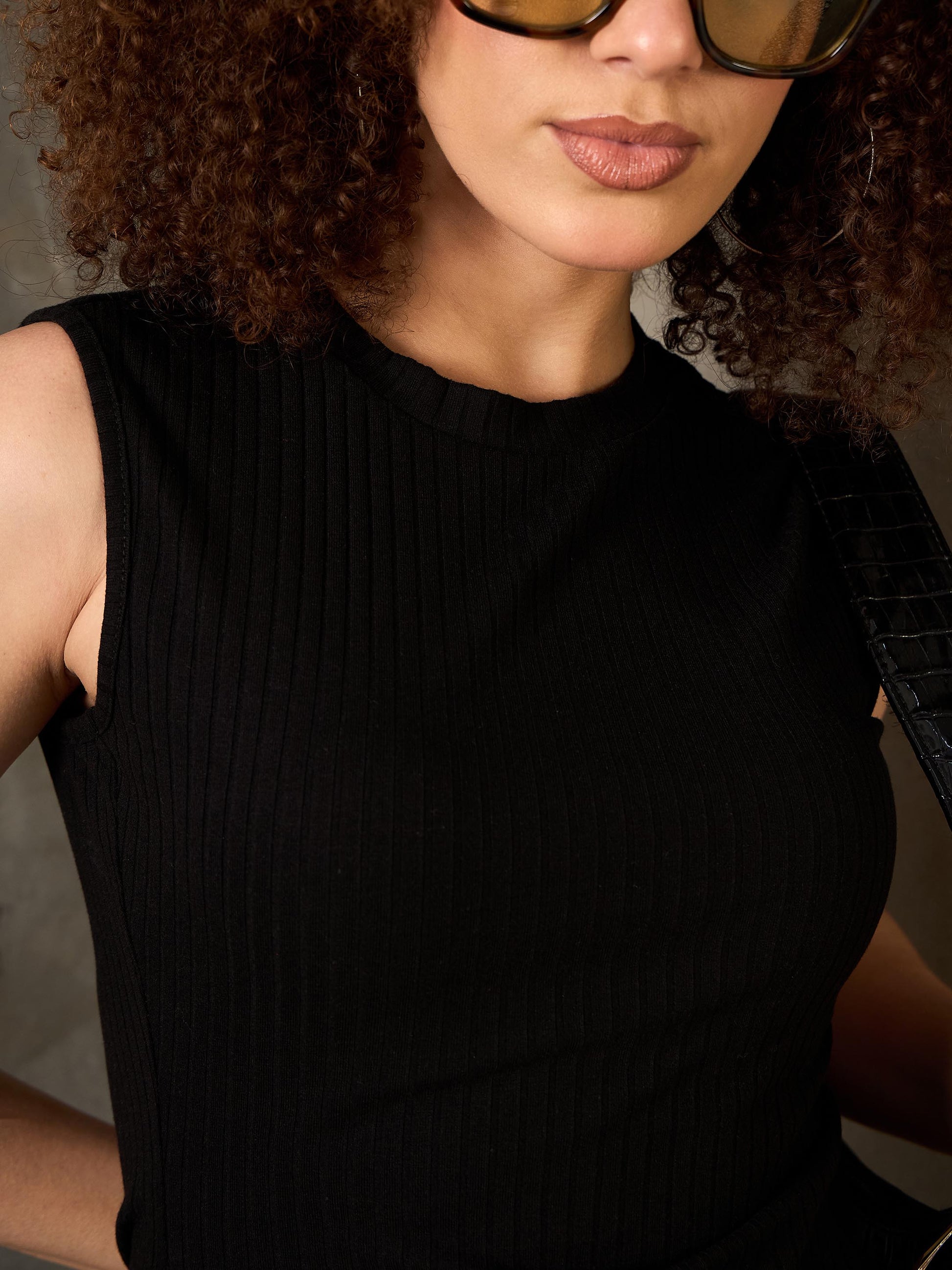 Black Rib Sleeveless Side Slit Top, in Rib fabric, Unlined, Regular Length, Slim Fit, NA, Straight Hemline and features Slit Detail At Side