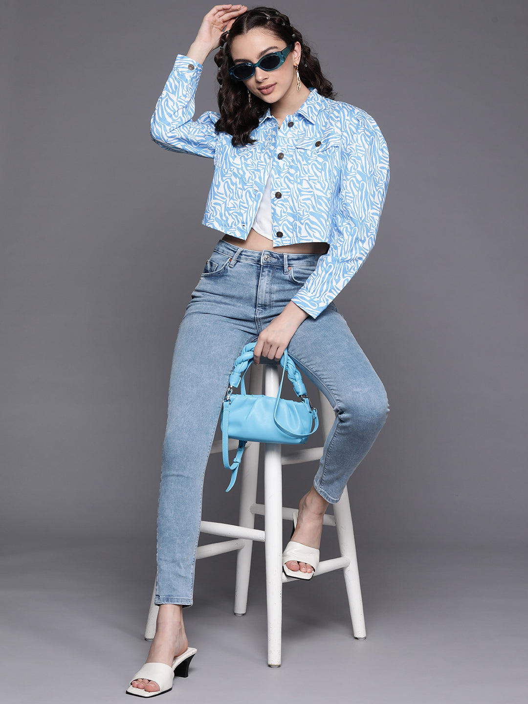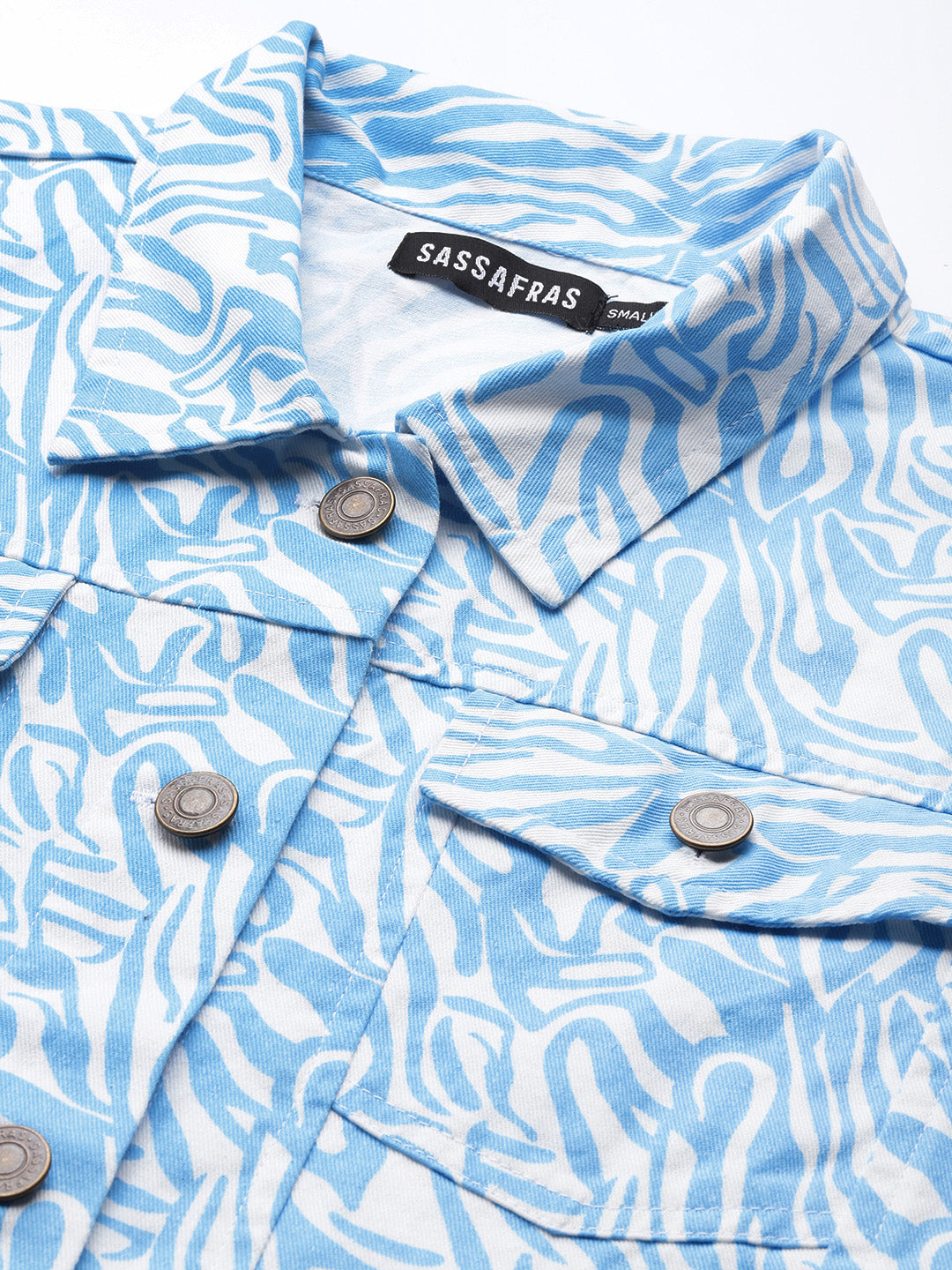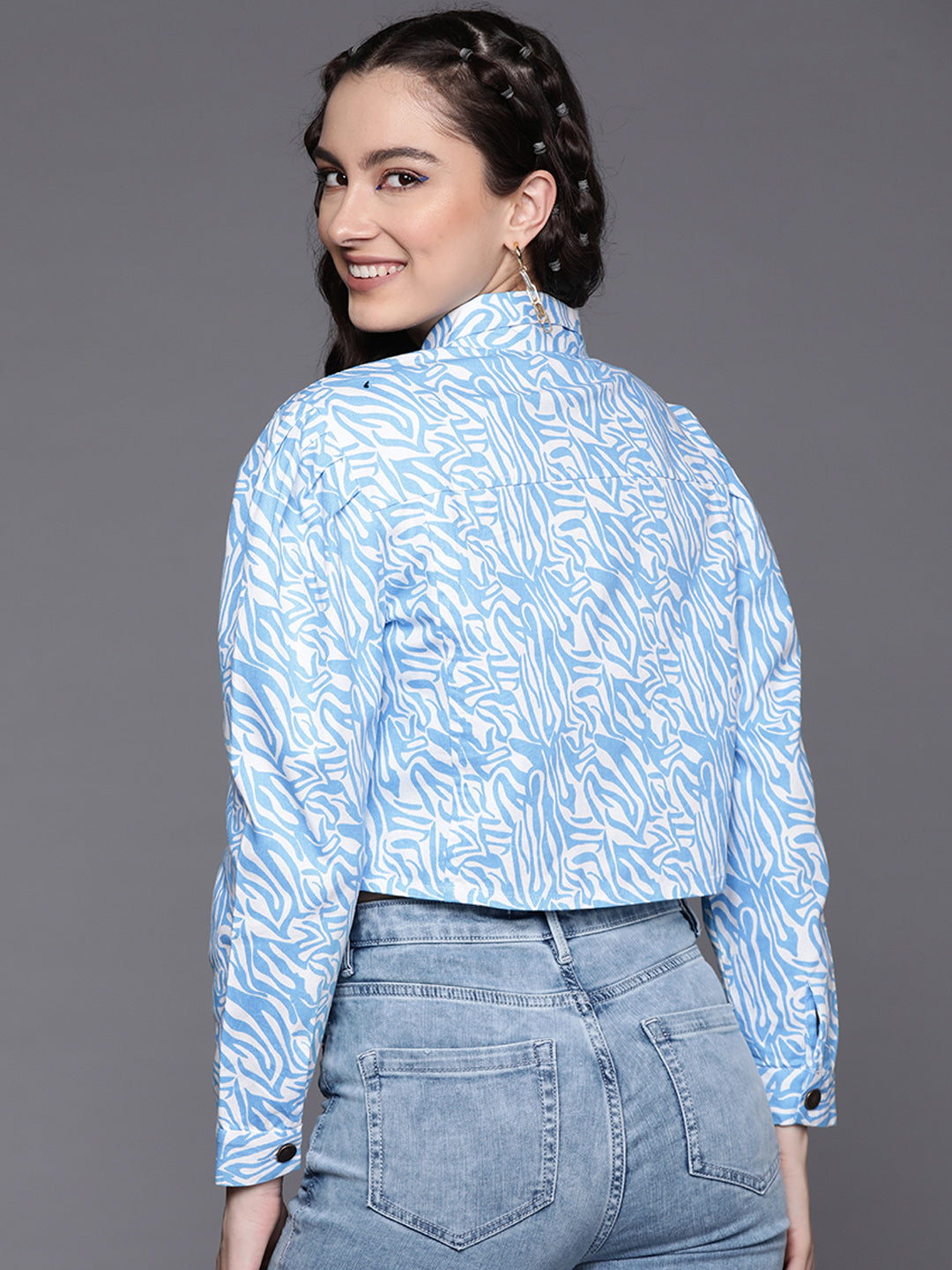 Women Blue Abstract Print Twill Crop Jacket