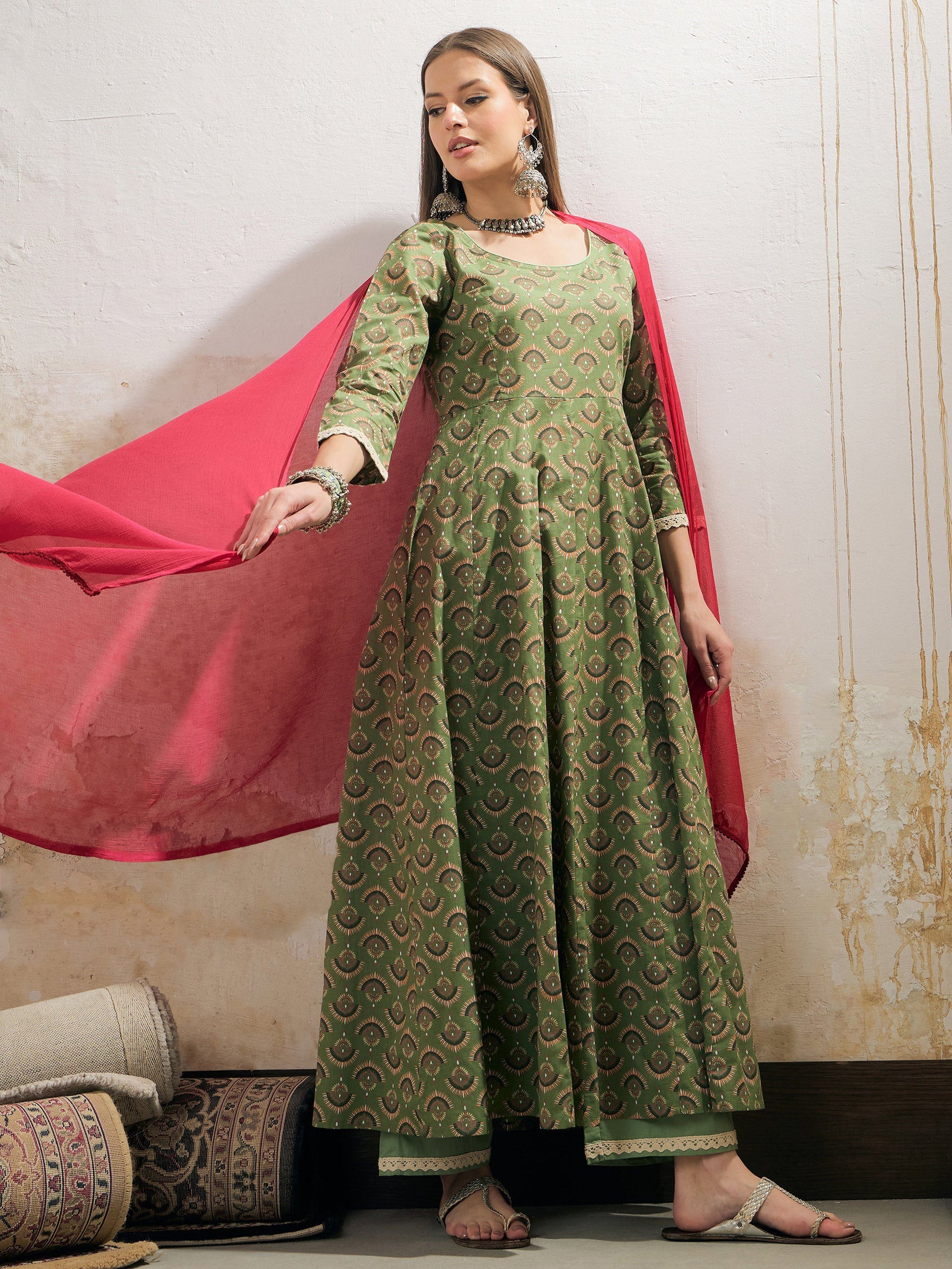 Women Green Floral Cambric Anarkali Kurta With Pencil Pants & Dupatta