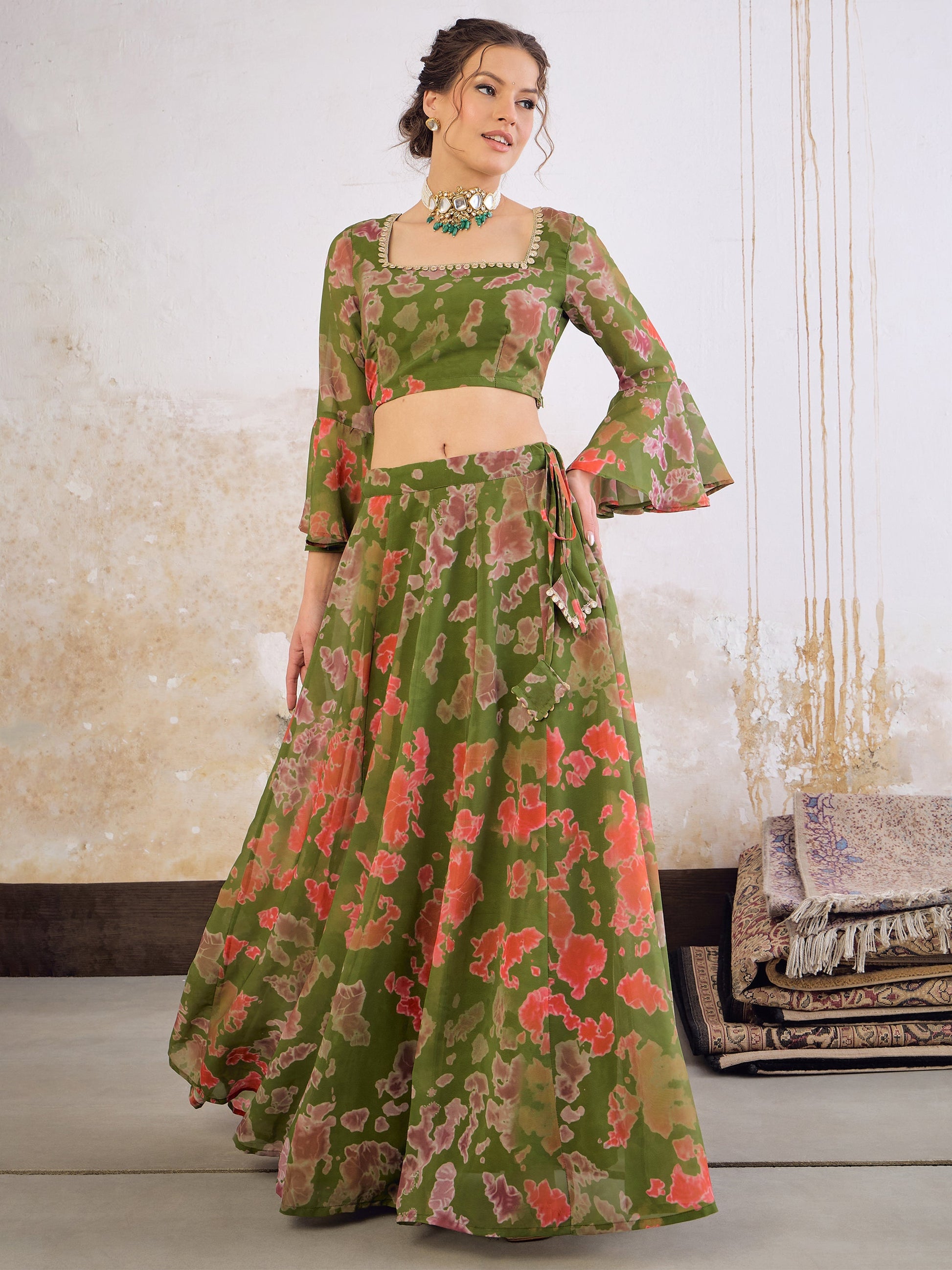 Women Green Tie & dye Crop Top With Anarkali Skirt