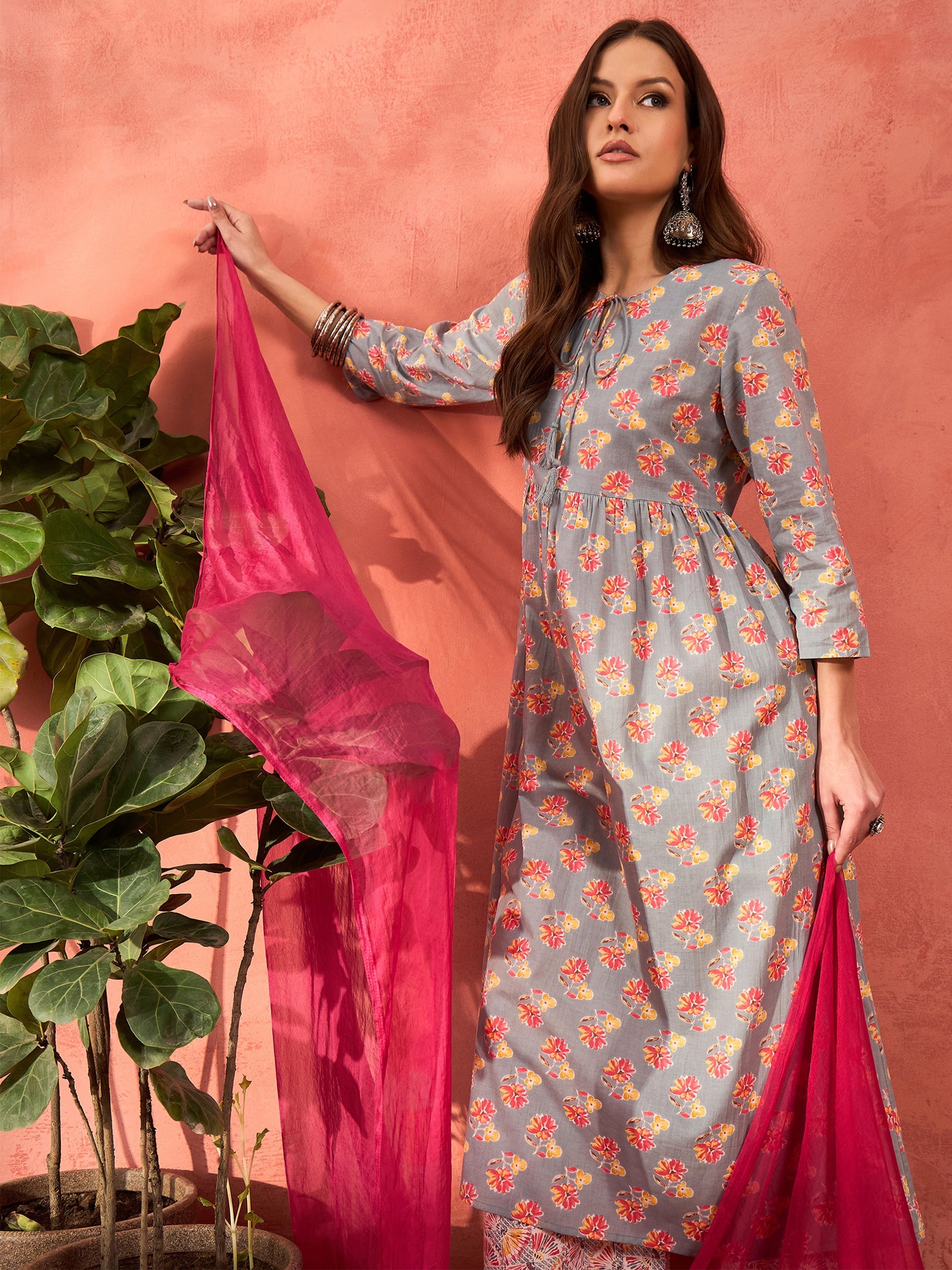 Women Grey Floral Front Dori Gathered Kurta With Pencil Pants & Dupatta