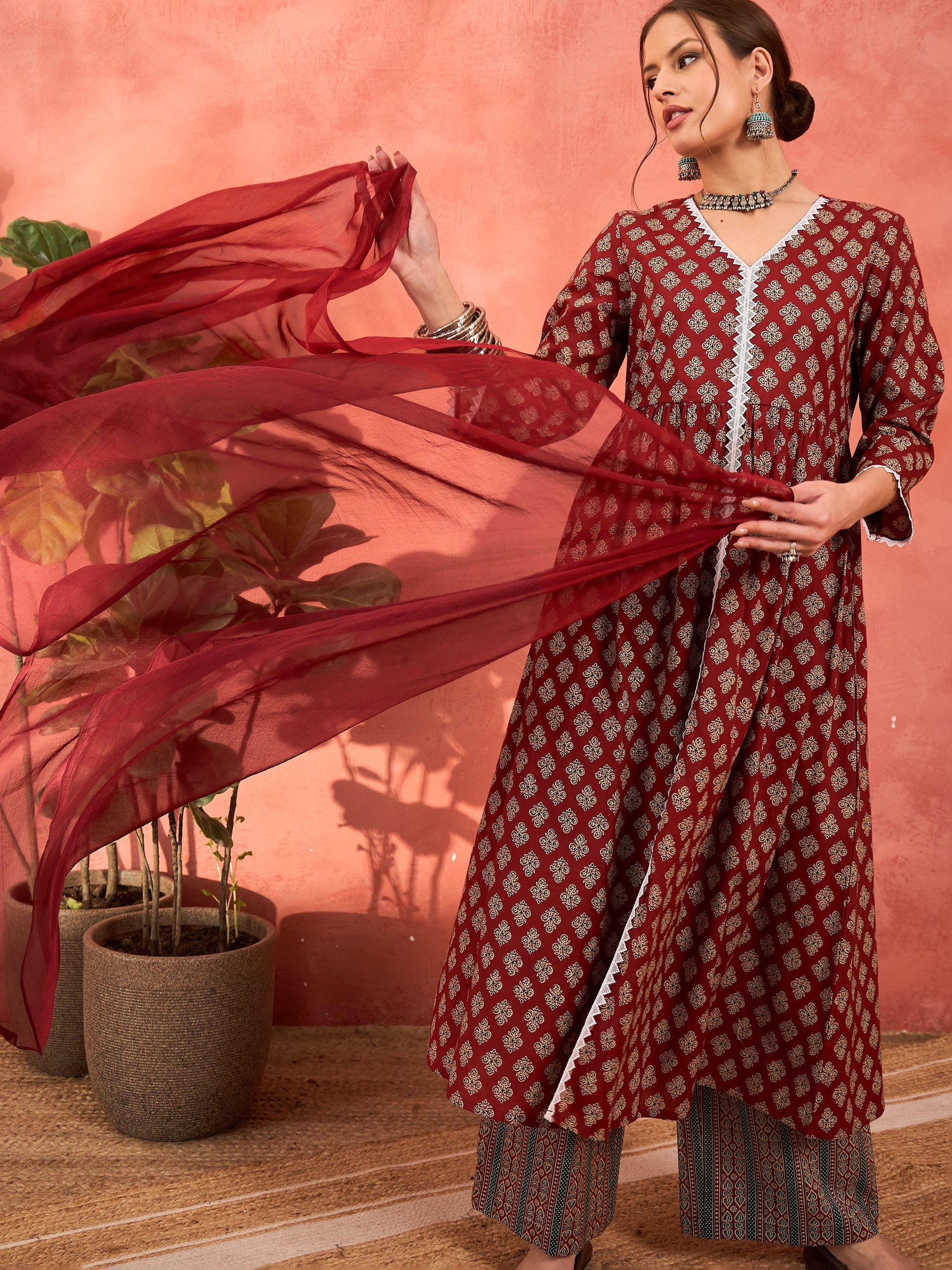 Women Maroon Floral Front Slit Kurta With Pencil Pants & Dupatta