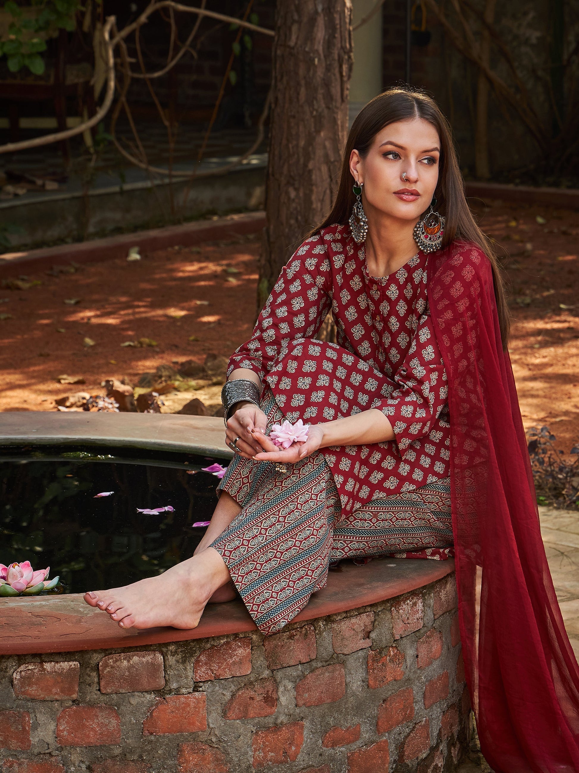 Women Maroon Floral Straight Kurta With Pants & Dupatta