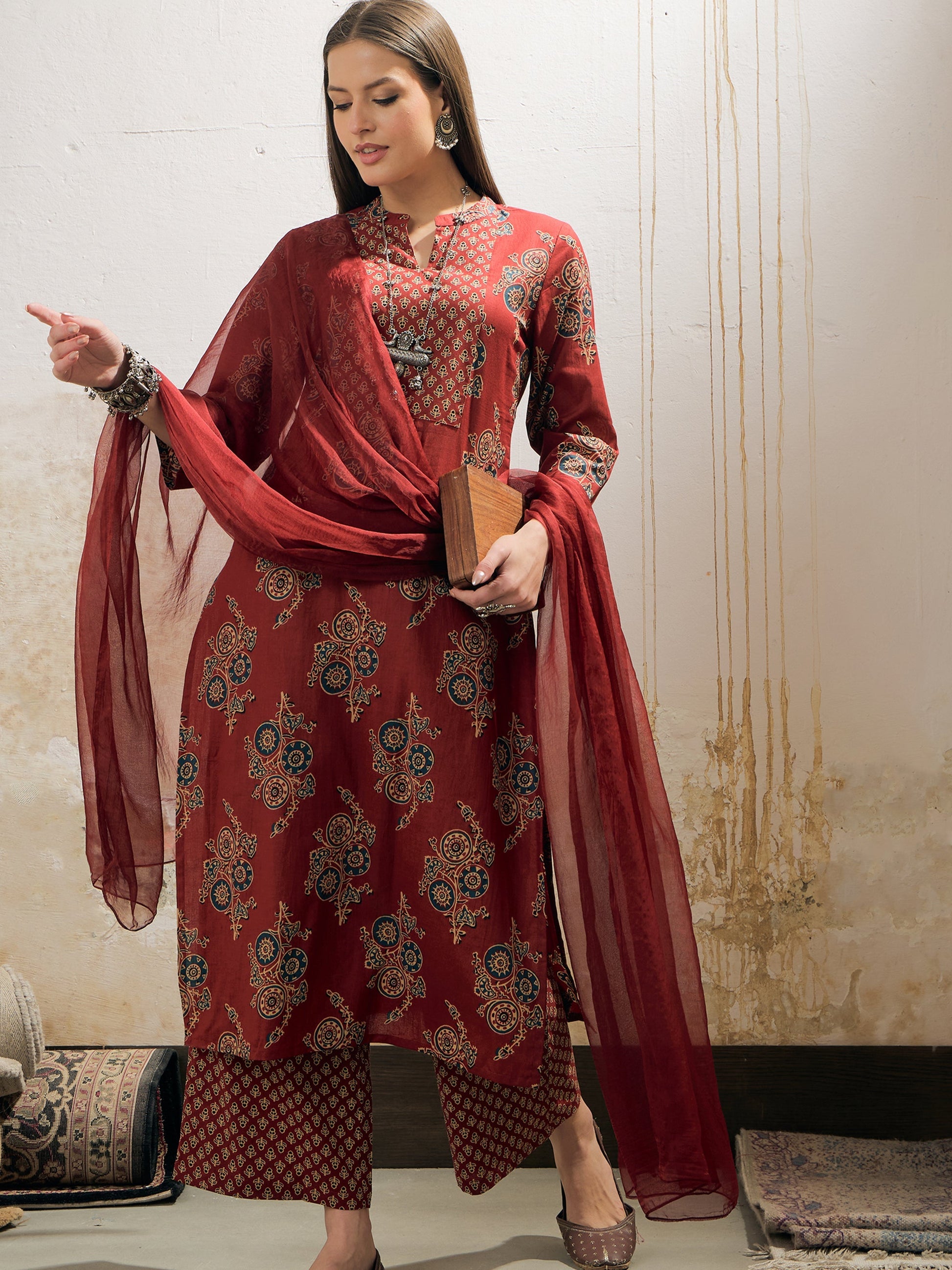 Women Maroon Floral Straight Kurta With Pencil Pants & Dupatta