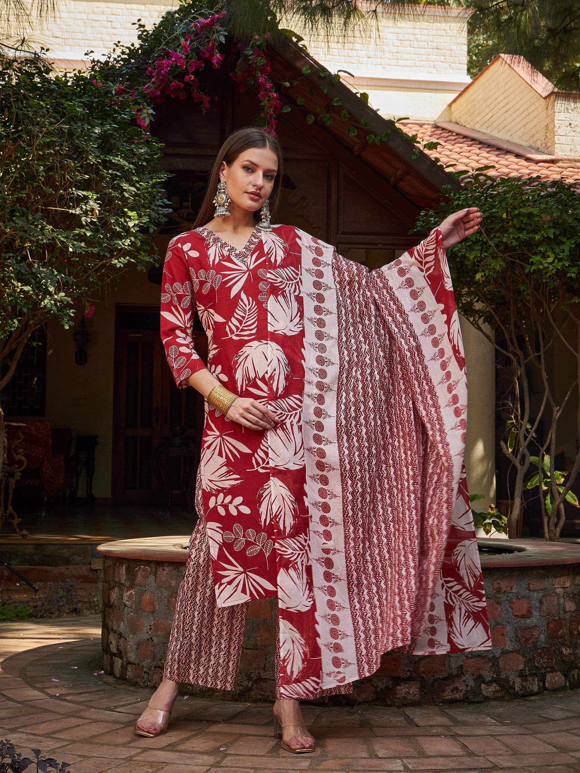 Title: Maroon Floral V Neck Kurta With Pencil Pants & Dupatta