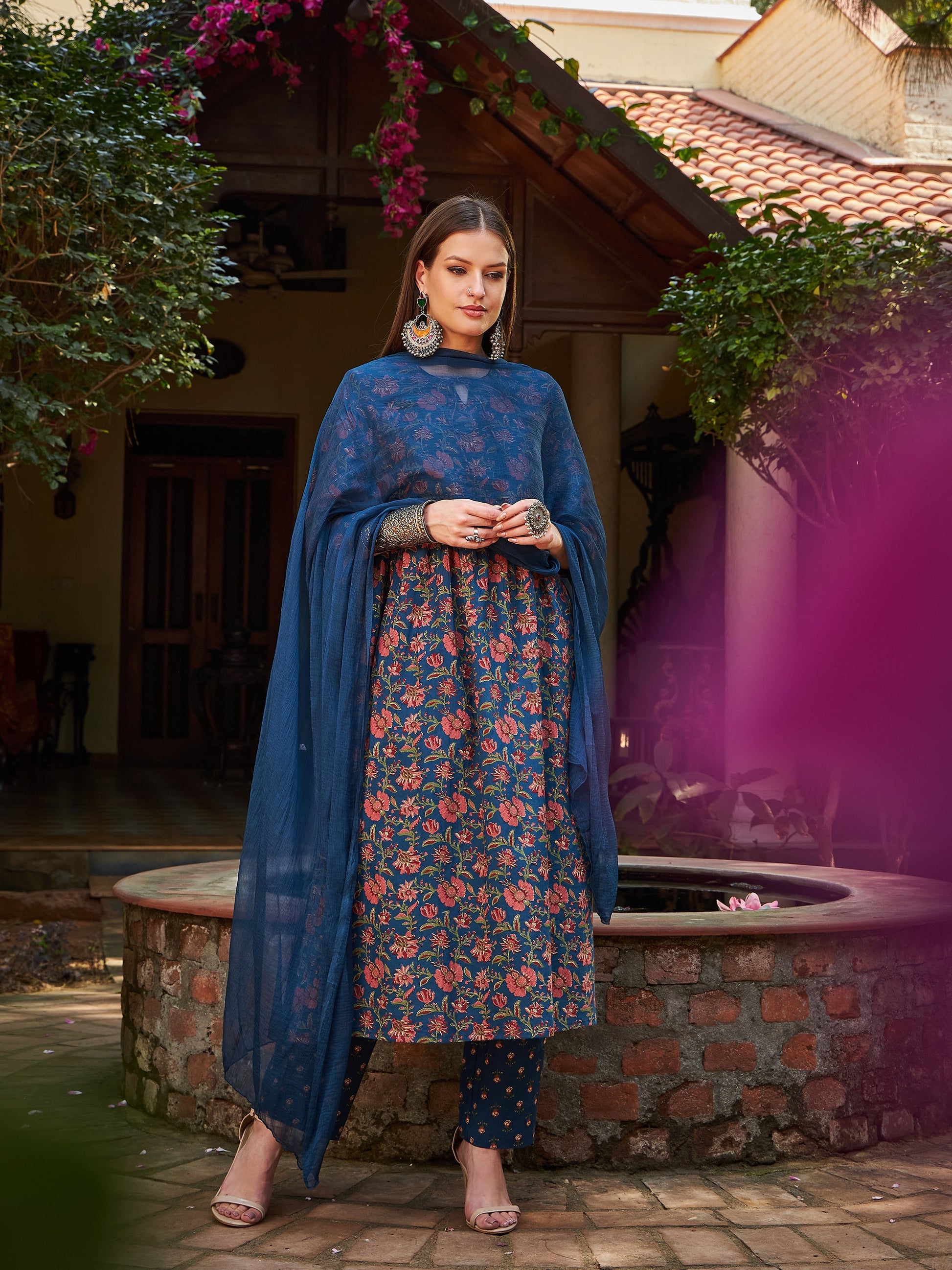 Title: Navy Floral Front Dori Gathered Kurta With Pencil Pants & Dupatta