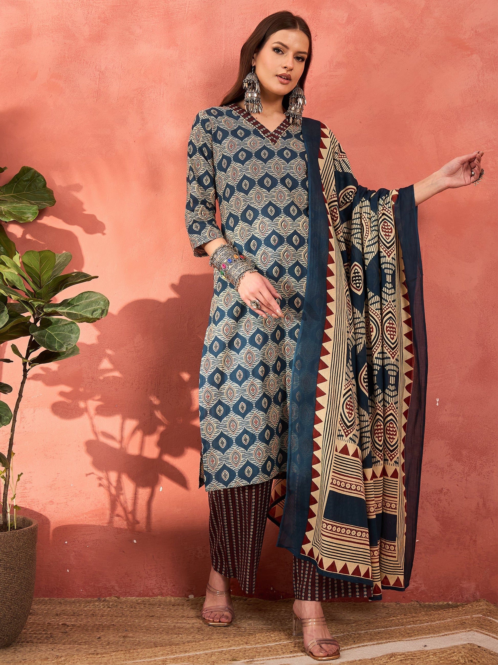 Title: Navy Geometric Print V Neck Kurta With Pencil Pants & Dupatta