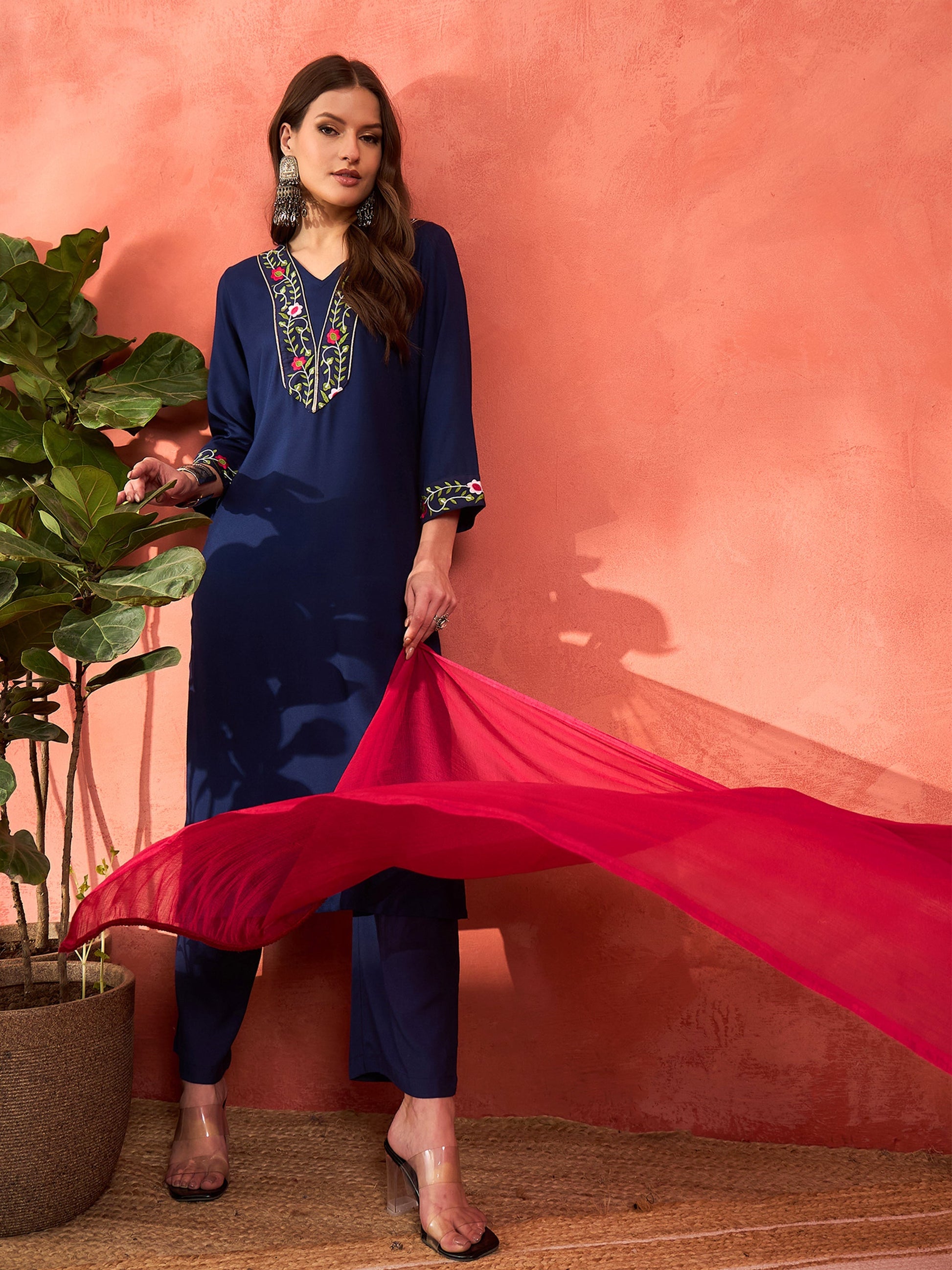 Women Navy Rayon Embroidered Kurta With Pencil Pants & Dupatta