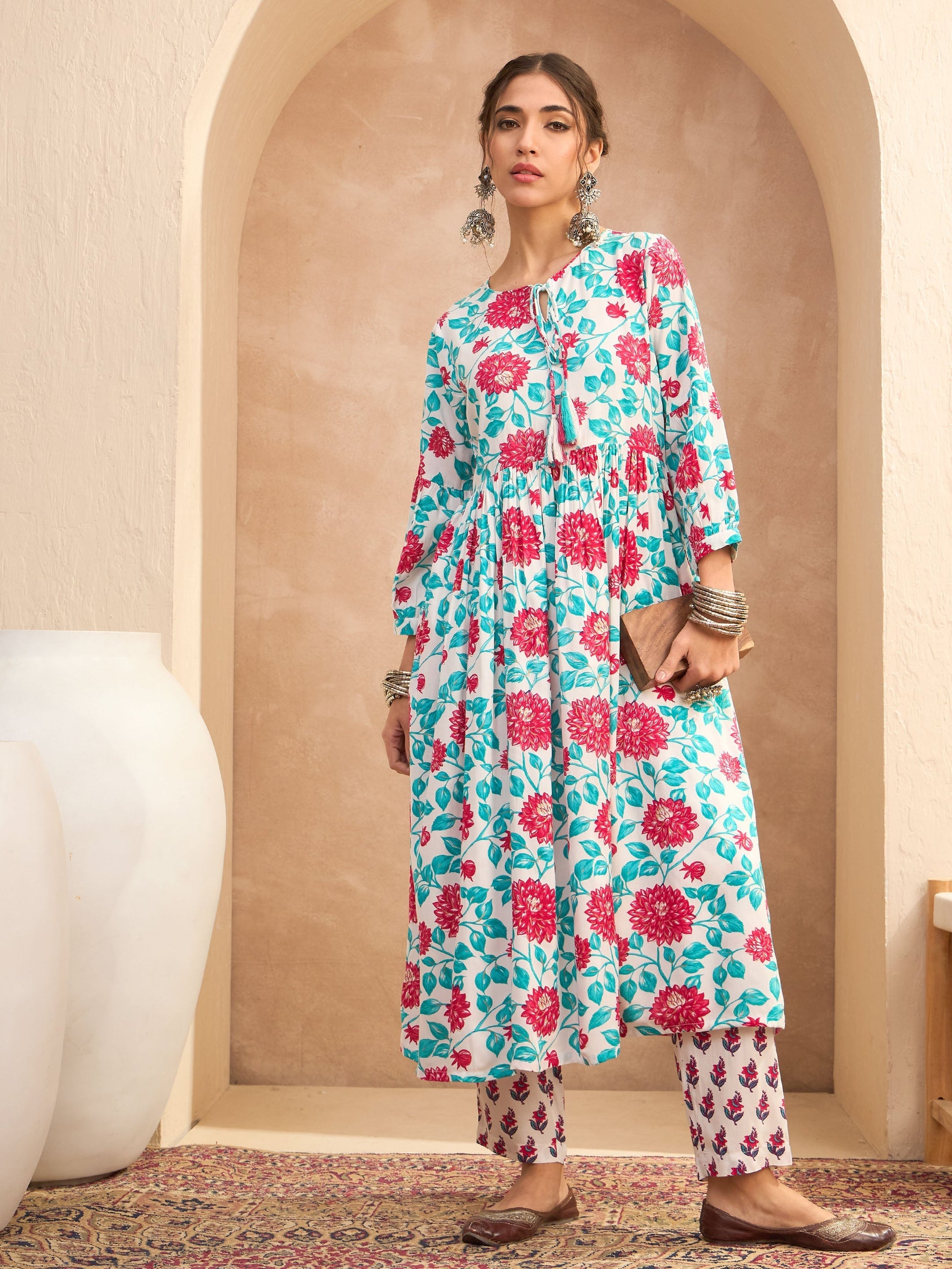 Women Off White Floral Gathered Kurta With Pencil Pants