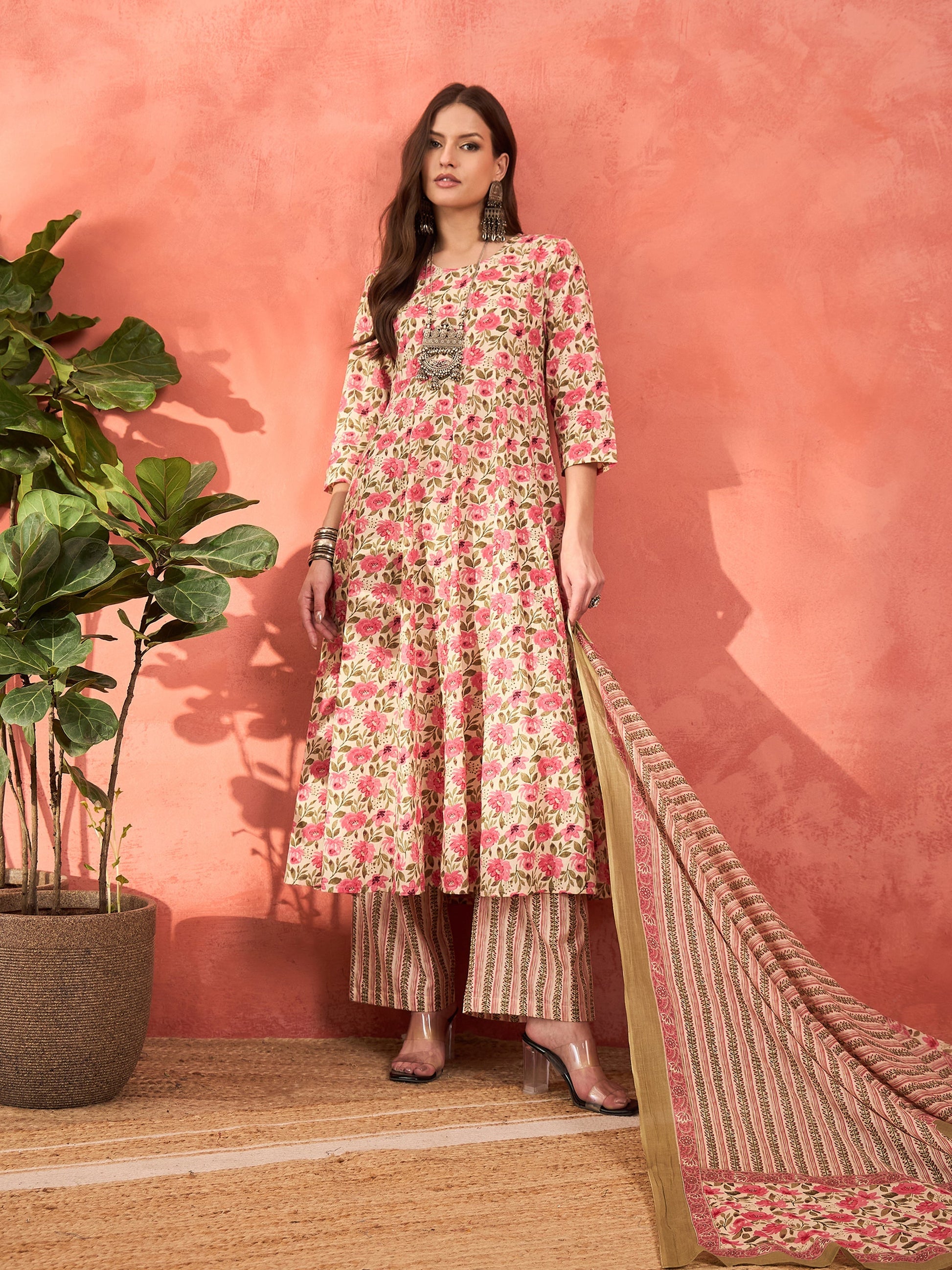Title: Off White & Pink Floral Anarkali Kurta With Pencil Pants & Dupatta
