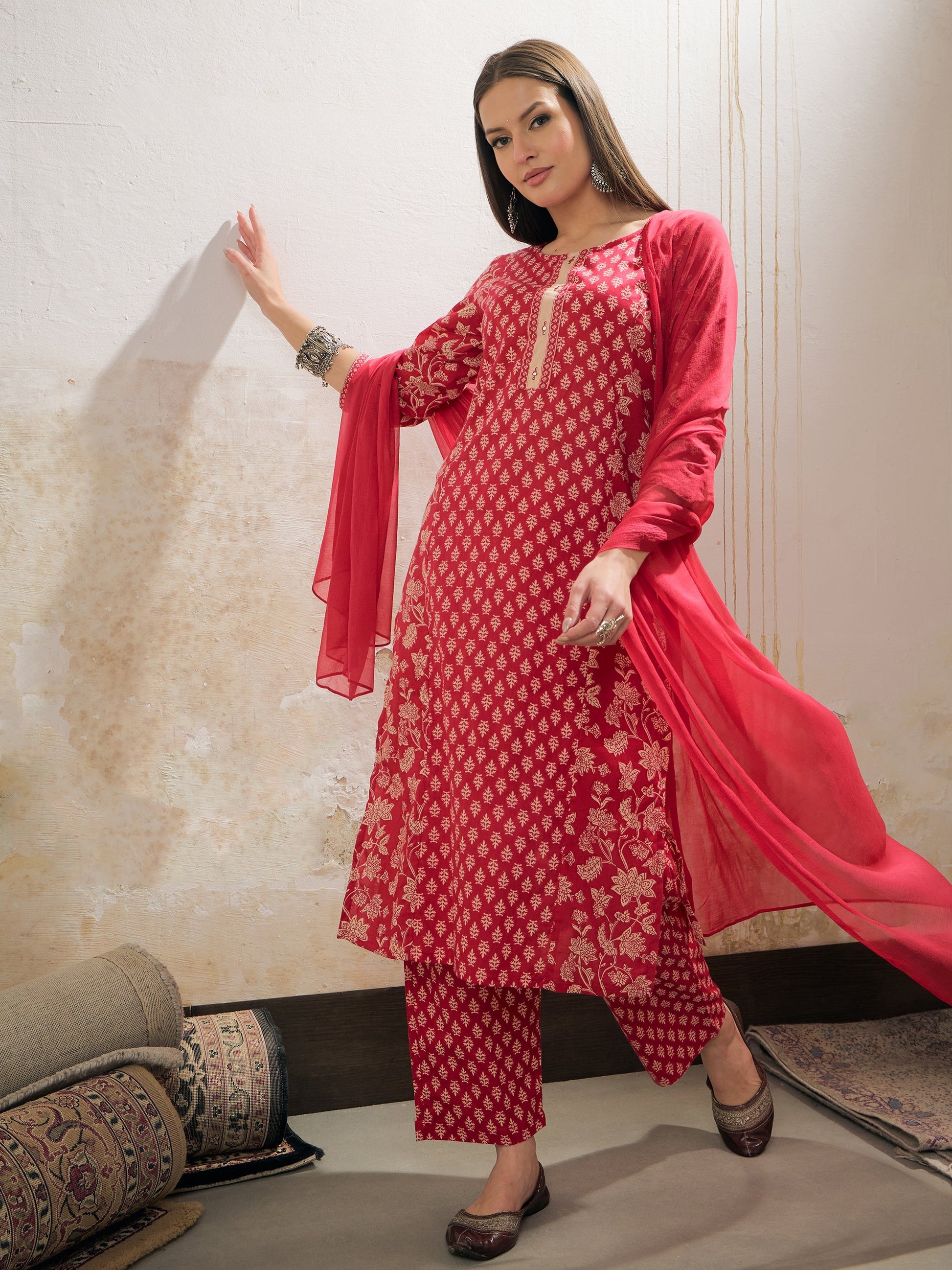 Women Pink Floral Cambric Kurta With Pencil Pants & Dupatta
