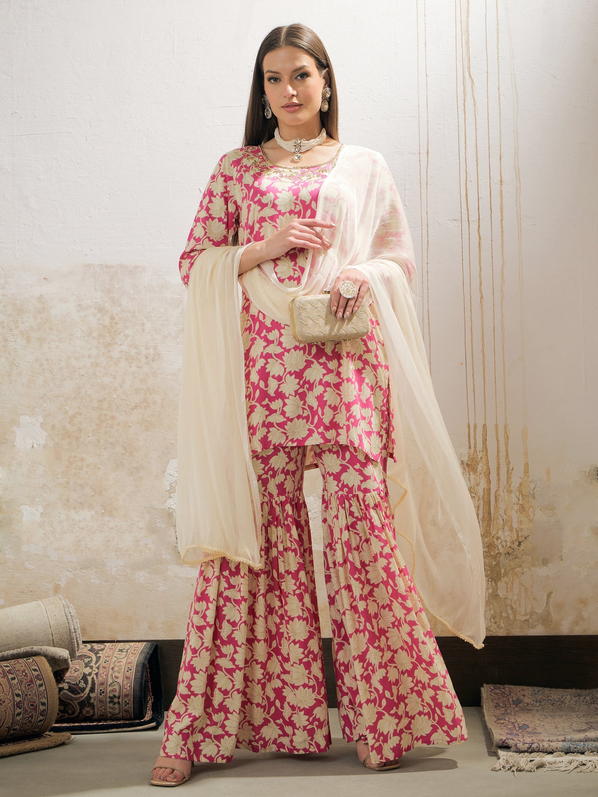 Women Pink Floral Embroidered Kurta With Sharara Pants & Dupatta