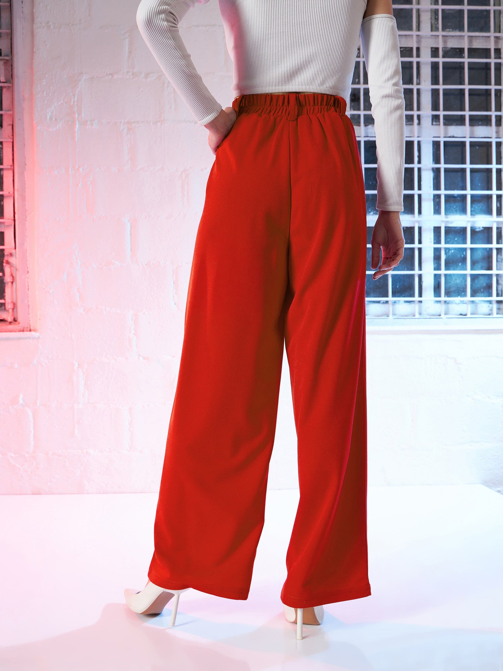 Red Korean Pleated Loose Fit Pants , in Canton Knit fabric, Unlined, Full Length, Loose Fit, Button Closure, Straight Hemline and features Collar Detail At Neck
